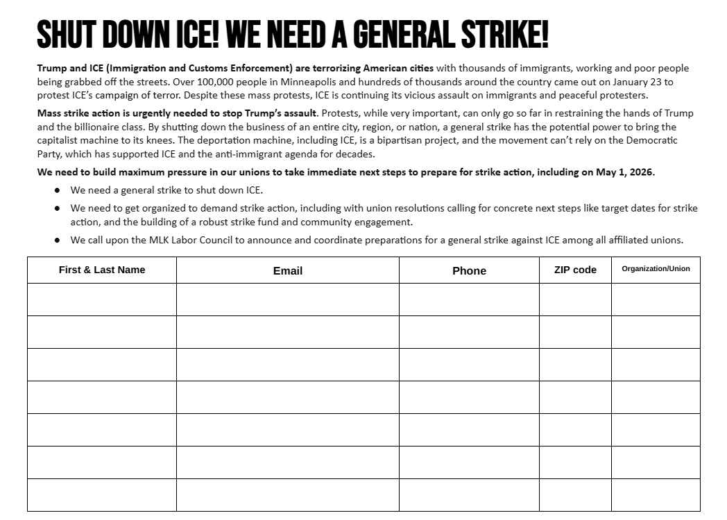 Hundreds of thousands of working and young people have courageously protested and risked arrests, faced down teargas and pepper spray, and endured other violence from ICE agents and police departments. But to shut down ICE and defeat Trump, working people need to organize strike actions, including general strikes, to pose a real threat to both Trump and the Republican and Democratic parties and to shut down the profit machine of the billionaire class. In order to build for strike actions, rank-and-file workers and union members will need to build independently in order to overcome the opposition of most of the labor leadership.