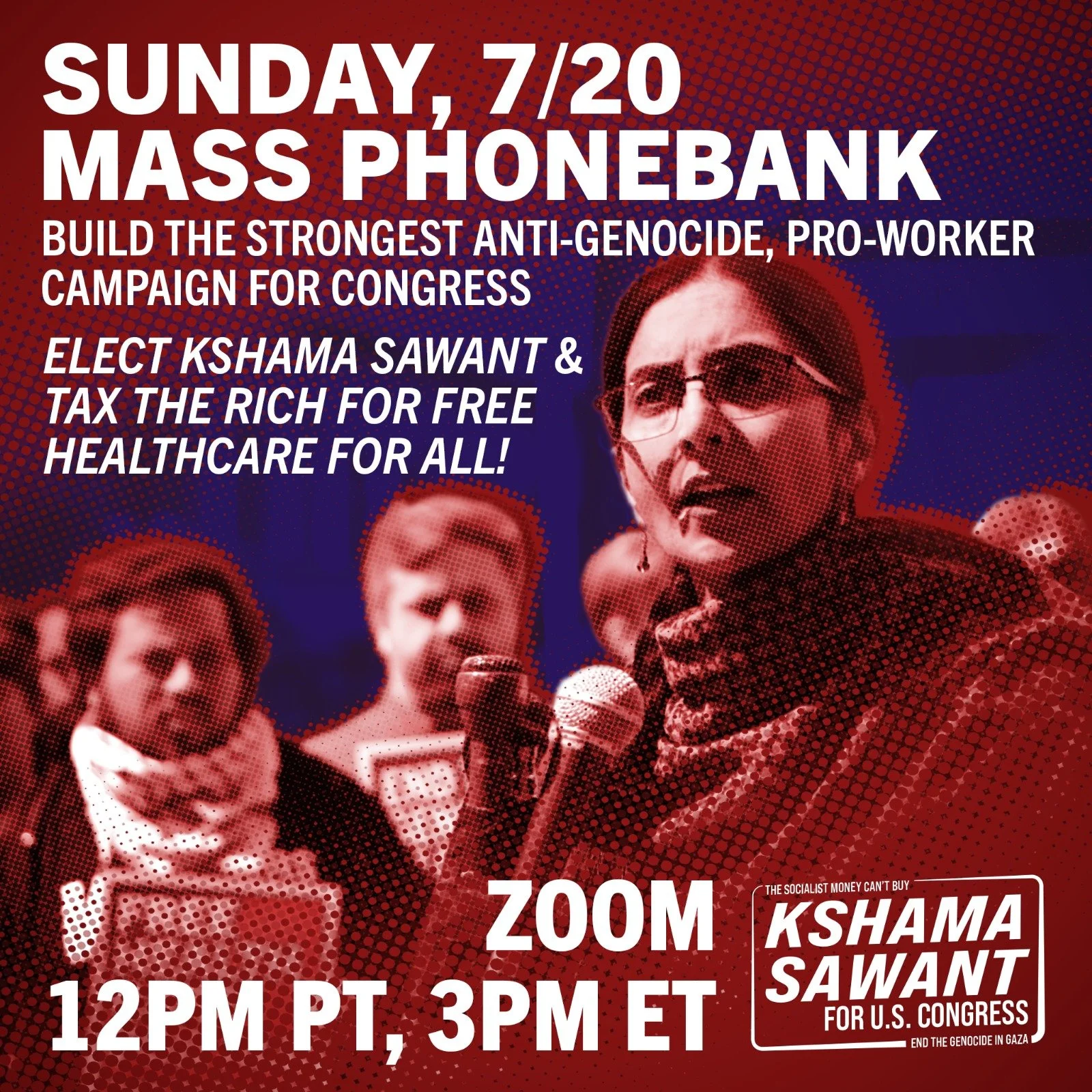 JOIN US SUNDAY July 20th @ 12 pm PT / 1 pm MT / 2 pm CT / 3 pm ET for a MEGAPHONEBANK to call hundreds of working people to build Kshama’s independent, anti-genocide, pro-worker campaign for Congress.