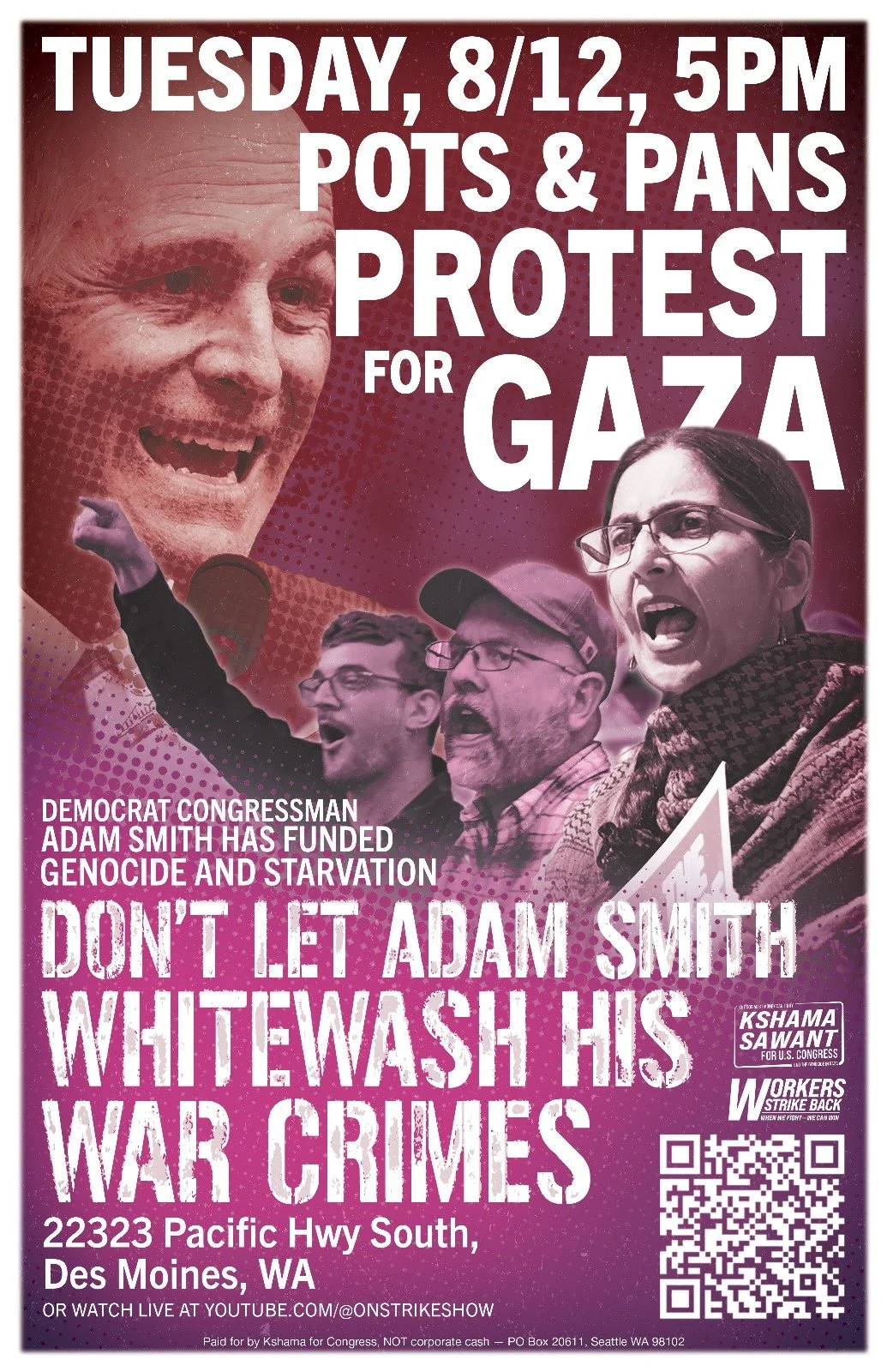 Democrat Adam Smith has voted repeatedly to fund the genocide in Gaza and to ban funds from the United Nations food distribution in Gaza, directly contributing to the mass starvation.