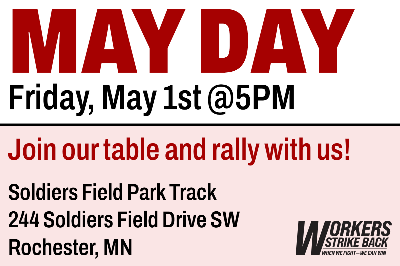 If you are in or around Rochester, MN, join Workers Strike Back members on May day for a rally and table at the Soldiers Field Park Track!