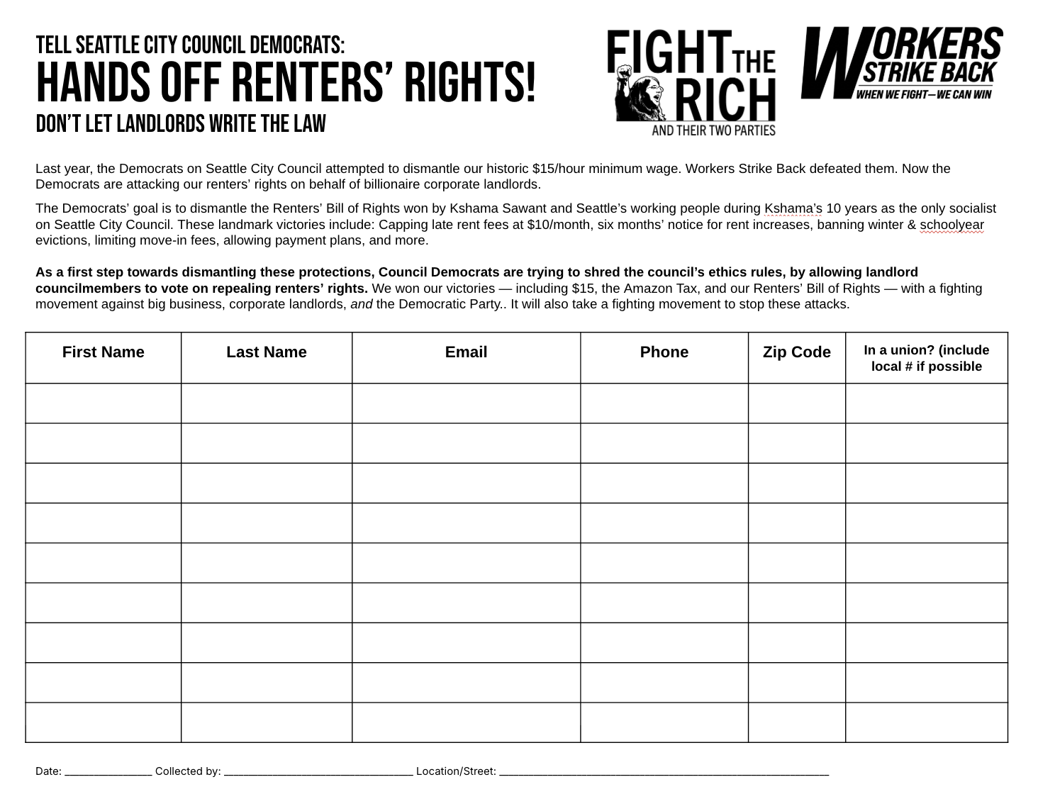 Last year, the Democrats on Seattle City Council attempted to dismantle our historic $15/hour minimum wage. Workers Strike Back defeated them. Now the Democrats are attacking our renters’ rights on behalf of billionaire corporate landlords.